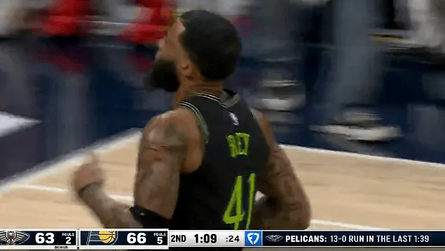 比赛的第二节,萨迪克-贝三分命中,鹈鹕落后15分后打出一波13-0步行者叫停。